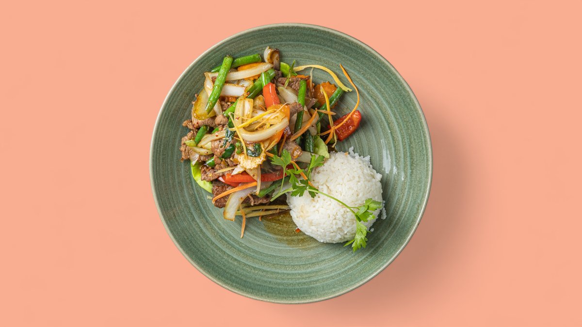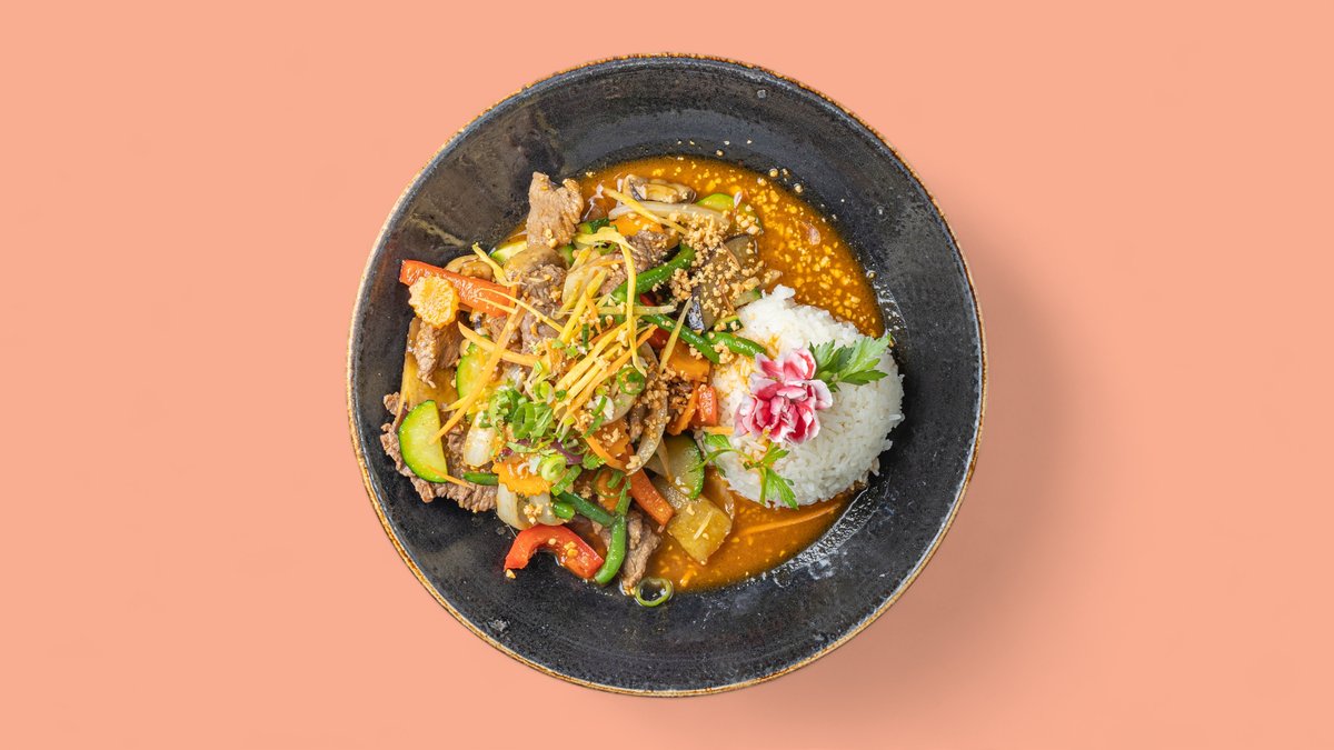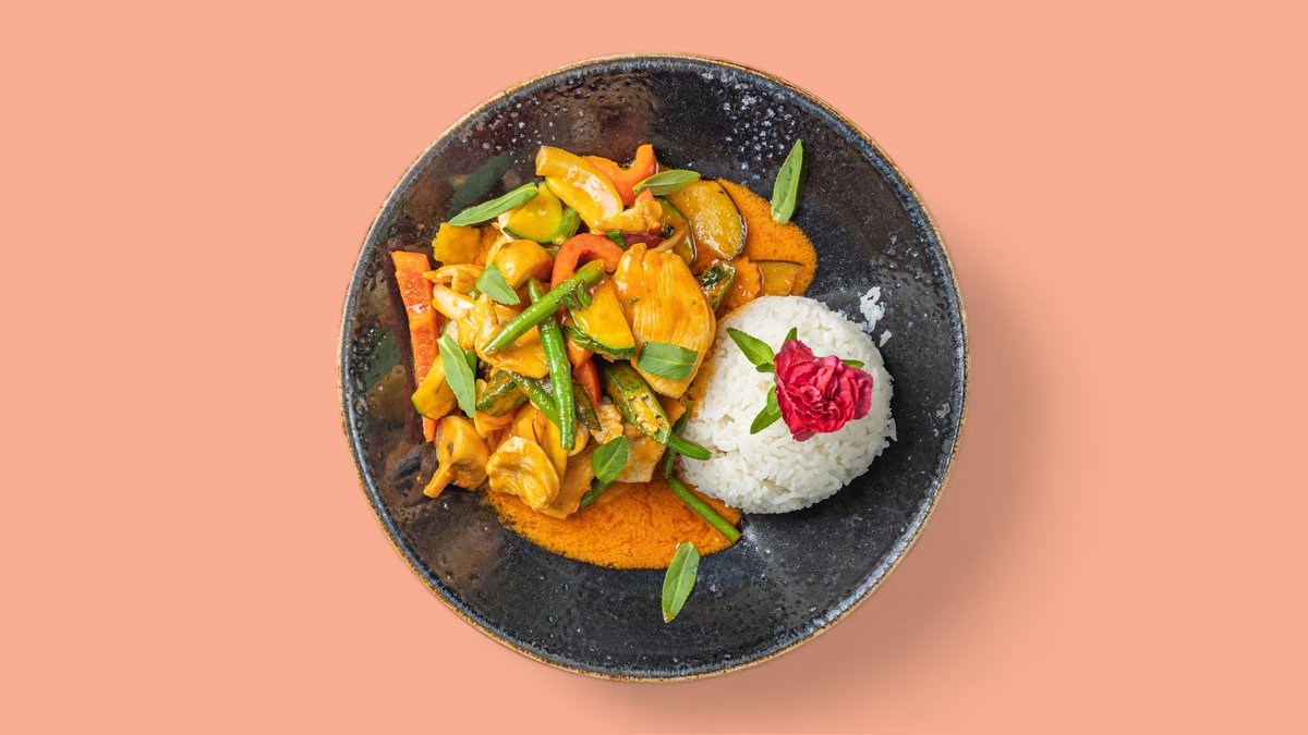 scharf RinderhĂĽfte gebraten mit frischem GartengemĂĽse in Danang Curry-ErdnusssoĂźe, verfeinert mit Thai-Basilikum und Jasminreis