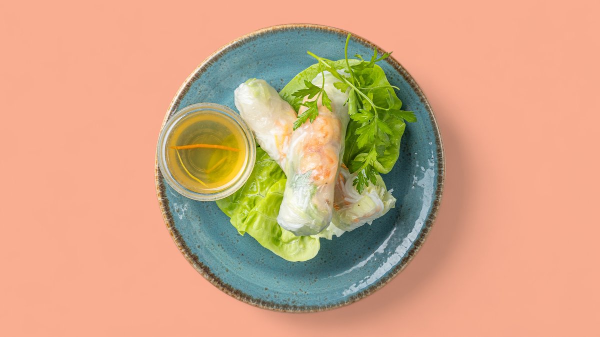 2 Stück Reispapierröllchen nach vietnamesischer Tradition mit Gurken, Salat, Karotten, Basilikum, Minze, frischen Sojasprossen, Poulardenfleisch und Shrimps, gefüllt mit Nuoc-Mam-Vinaigrette, auf Wunsch auch vegetarisch möglich