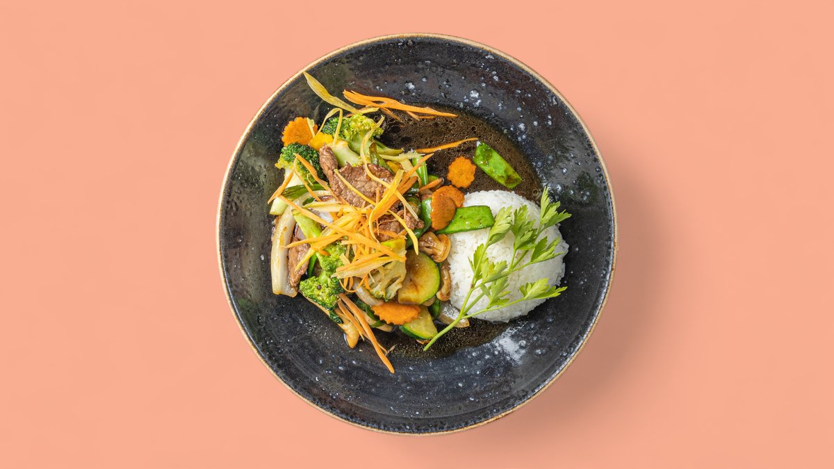 scharf gebratene argentinische Rinderhüfte mit knackigem Brokkoli und feinen Zuckerschoten in einer kräftigen Kikkoman-Sojasoße und Jasminreis