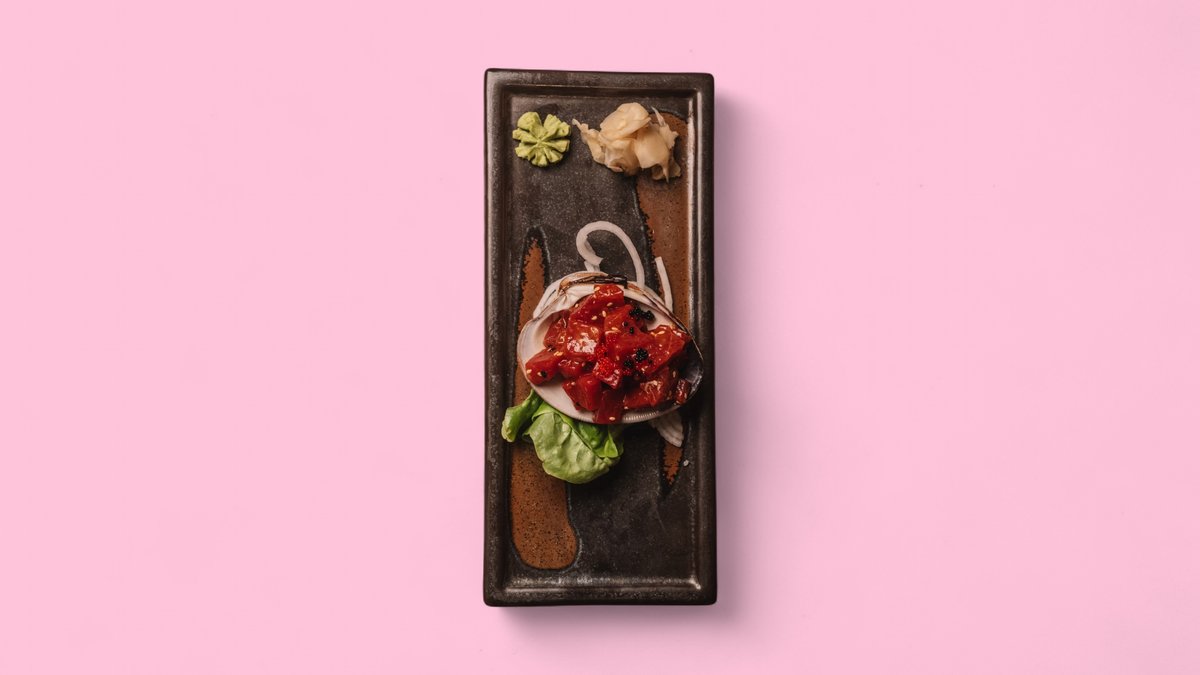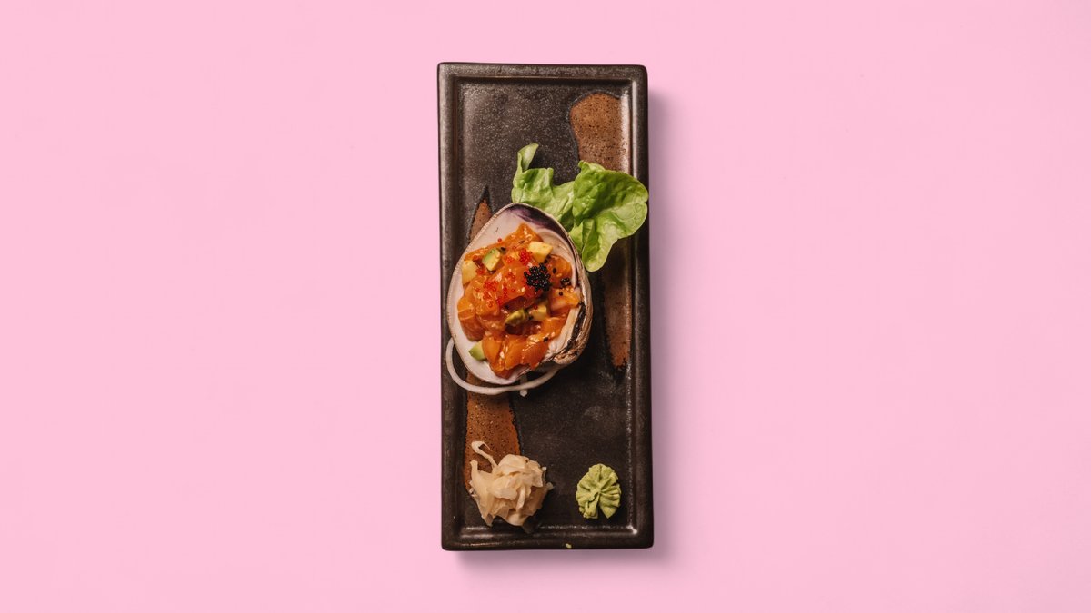 with rocket, cream cheese, flamed salmon tartare and yuzu sauce Contains alcohol, not suitable for children and pregnant women