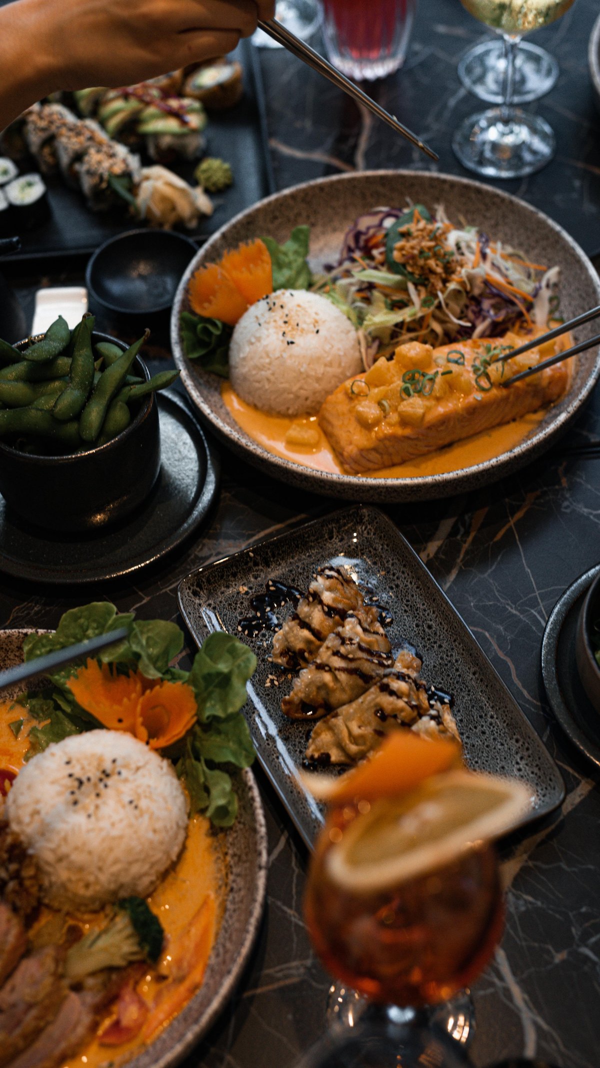 with tempura shrimps, flamed salmon, avocado, cucumbers, yuzu sauce and cream cheese Contains alcohol, not suitable for children and pregnant women