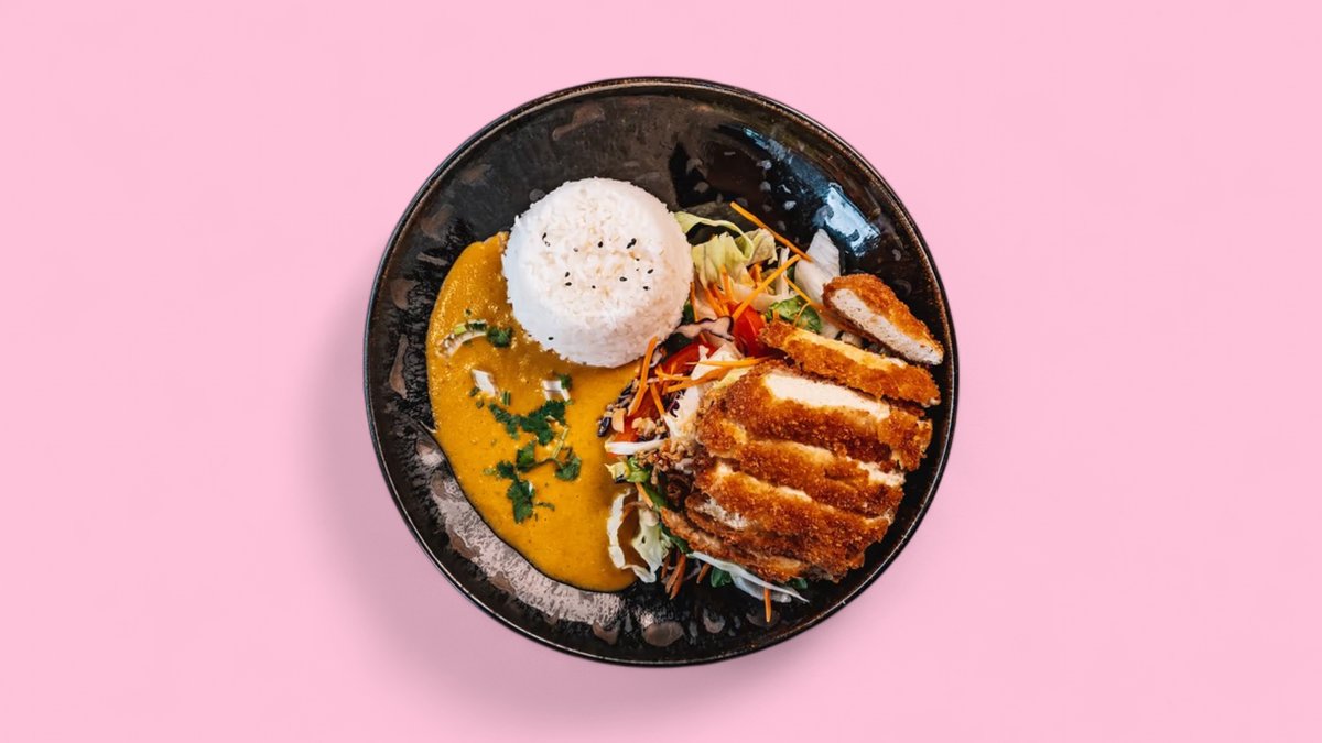 crispy chicken breast fillet with salad, peanut sauce, Asian herbs and rice
