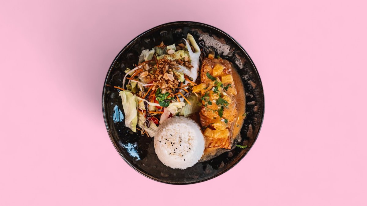 chicken breast fillet in slightly spicy red curry sauce with herbs, peanuts, fresh salad and rice