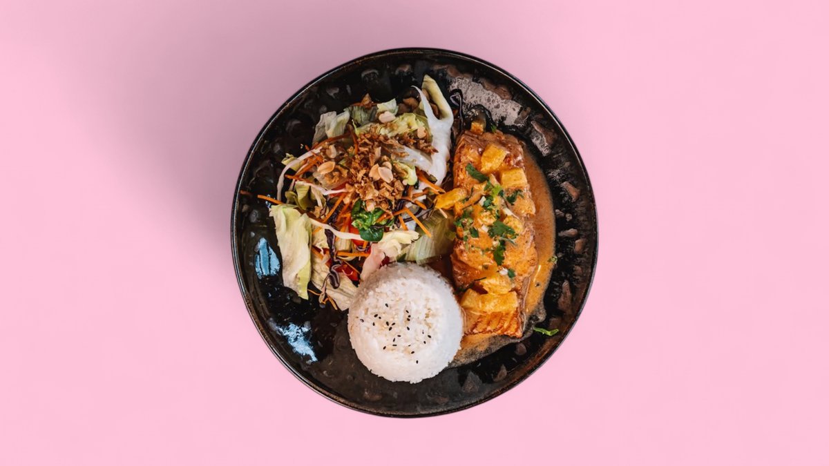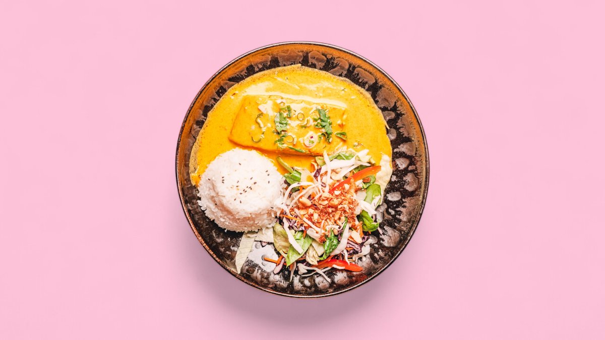 chicken breast fillet in slightly spicy red curry sauce with herbs, peanuts, fresh salad and rice