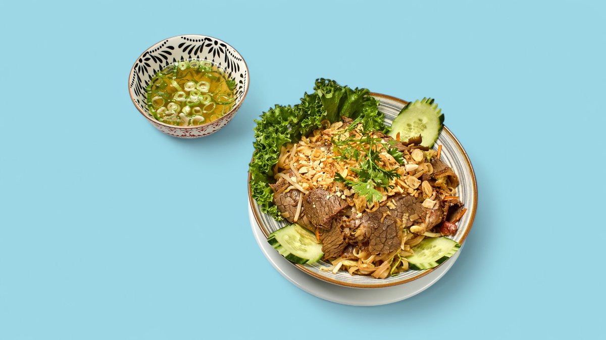 Reisbandnudel-Bowl lauwarm mit blanchierten Sojasprossen, Salat, Koriander, gerösteten Erdnüssen, Zwiebeln, Süß-Sauer-Sojasoße und einer Zutat deiner Wahl. Kleine Brühe separat