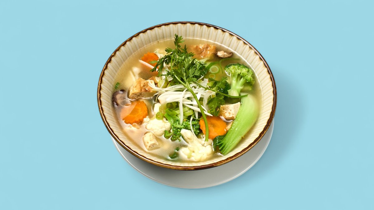 rice noodle soup in a vegan broth with seasonal vegetables, bean sprouts, shiitake mushrooms, pak choi and tofu