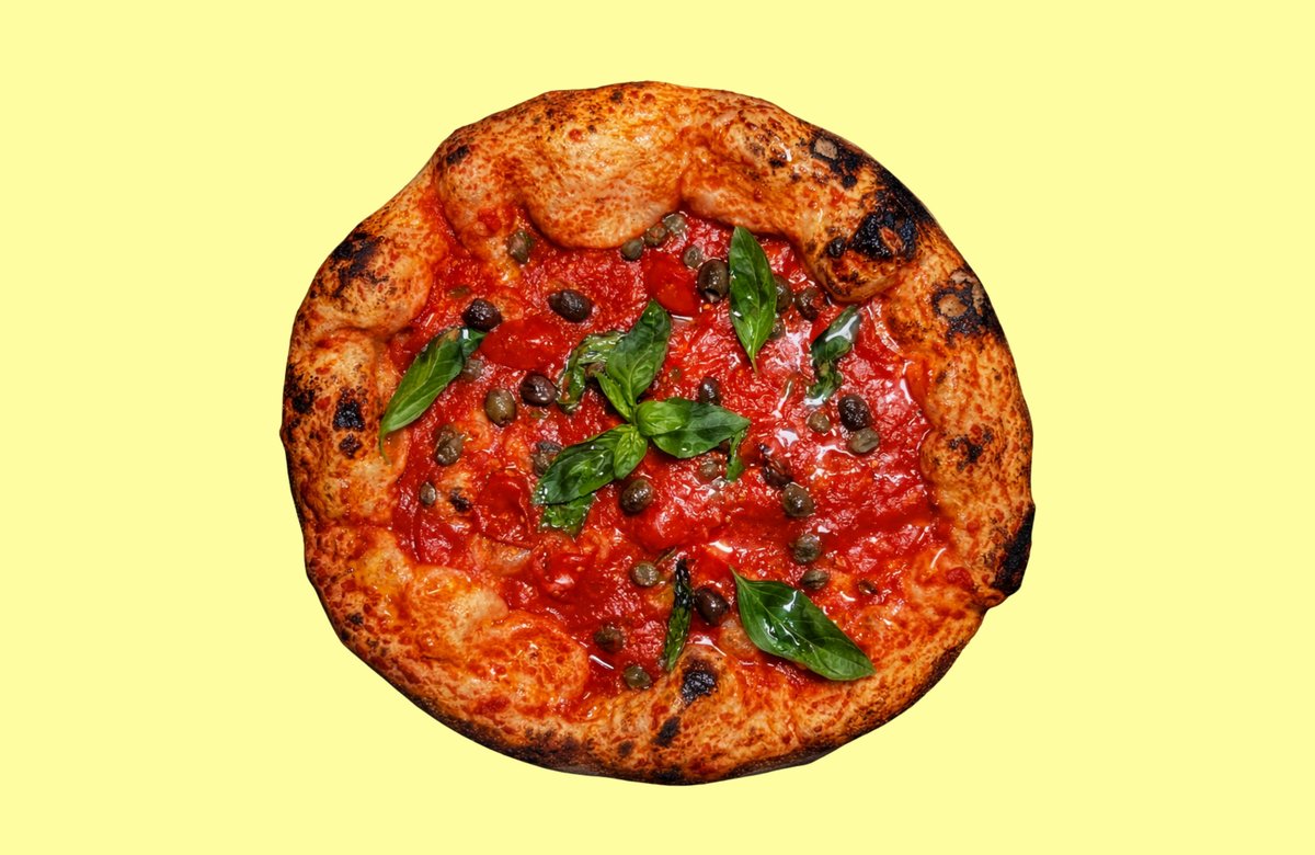 with San Marzano tomatoes, pomodorino del piennolo from Vesuvius (cherry tomatoes), anchovies from Cetara, capers from Salina, leccino olives, extra virgin olive oil, fresh basil, and mountain oregano from southern Italy