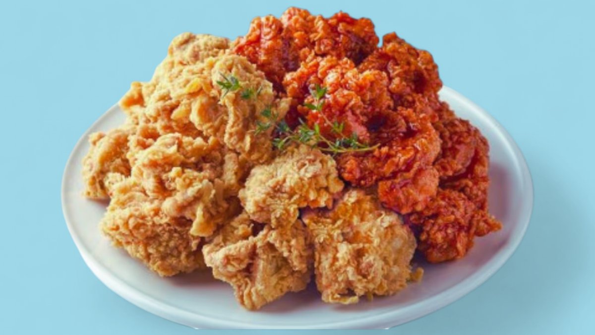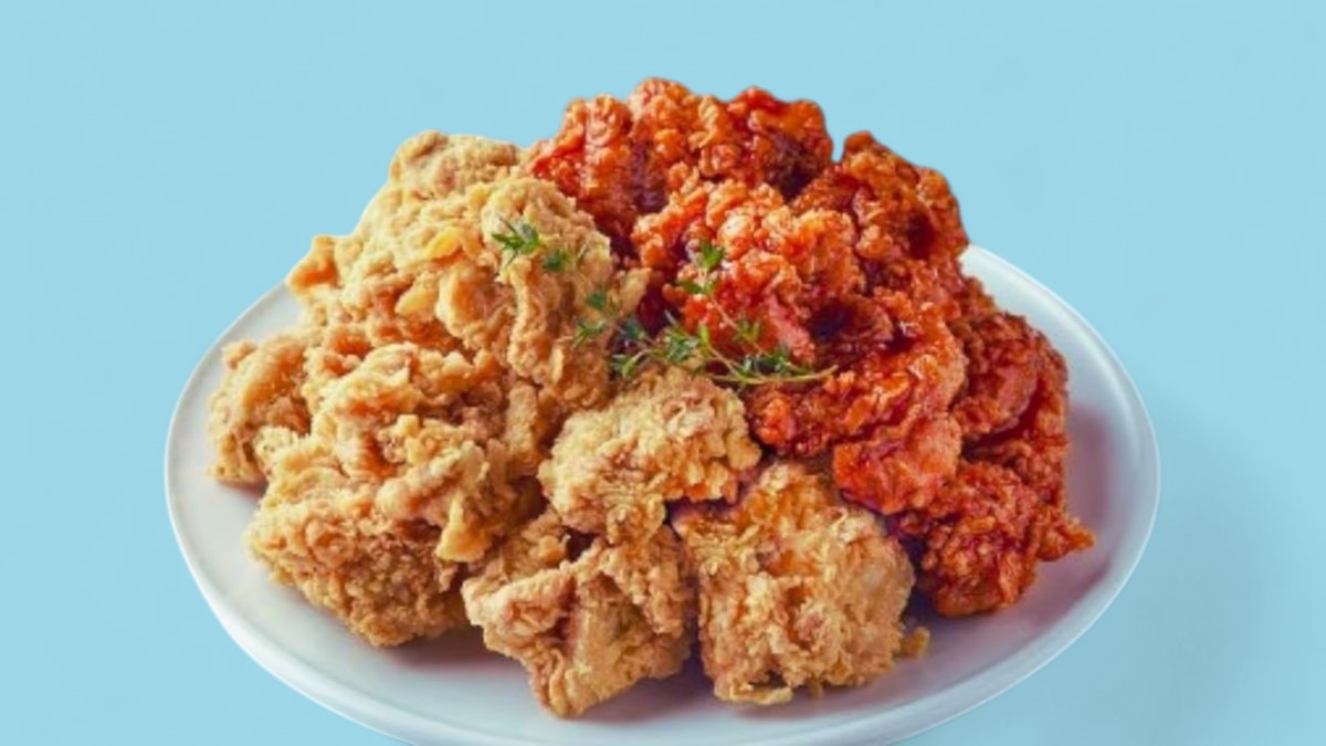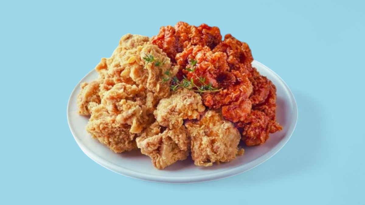 Eine beliebte Art, koreanisches Hühnchen in Südkorea zu essen. Die Hälfte der Hähnchenkeulen kommt ohne Soße, um den Geschmack auszugleichen.