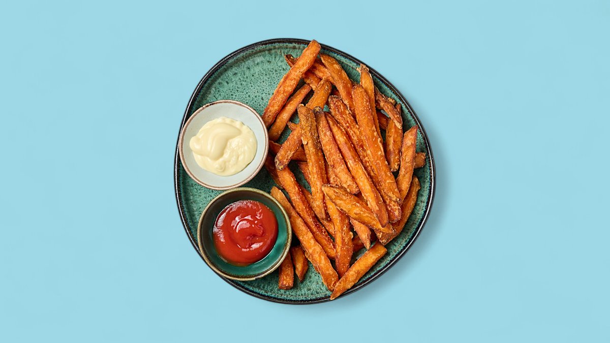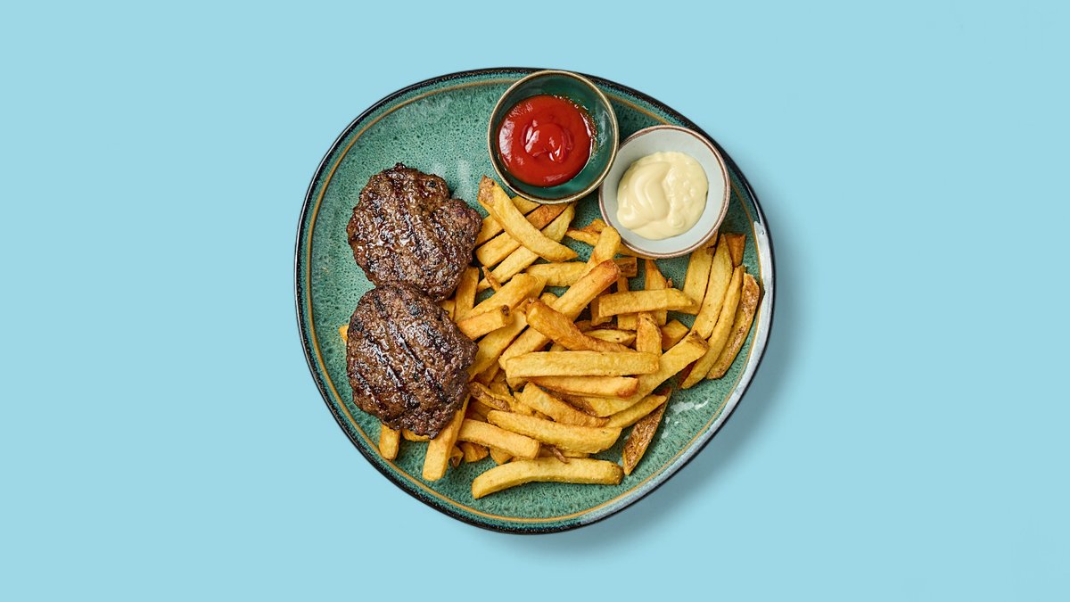 mit 2x 100 g hausgemachten Fleischkücheln vom Rind und Underdog's-Pommes frites