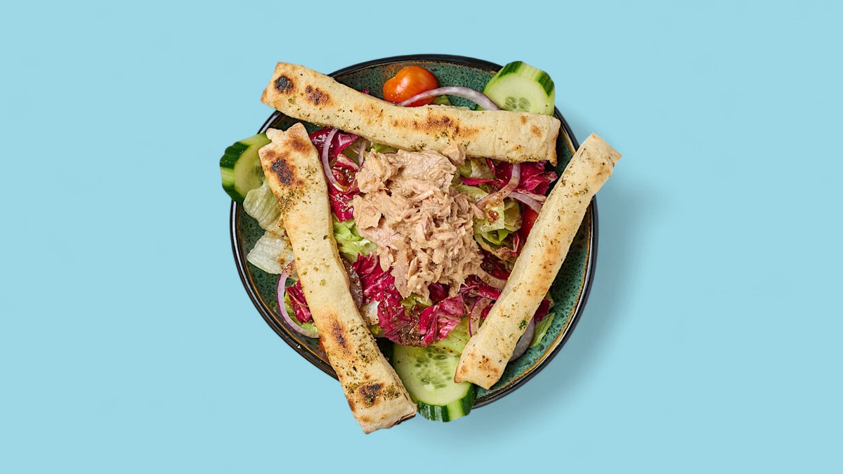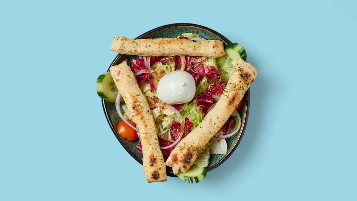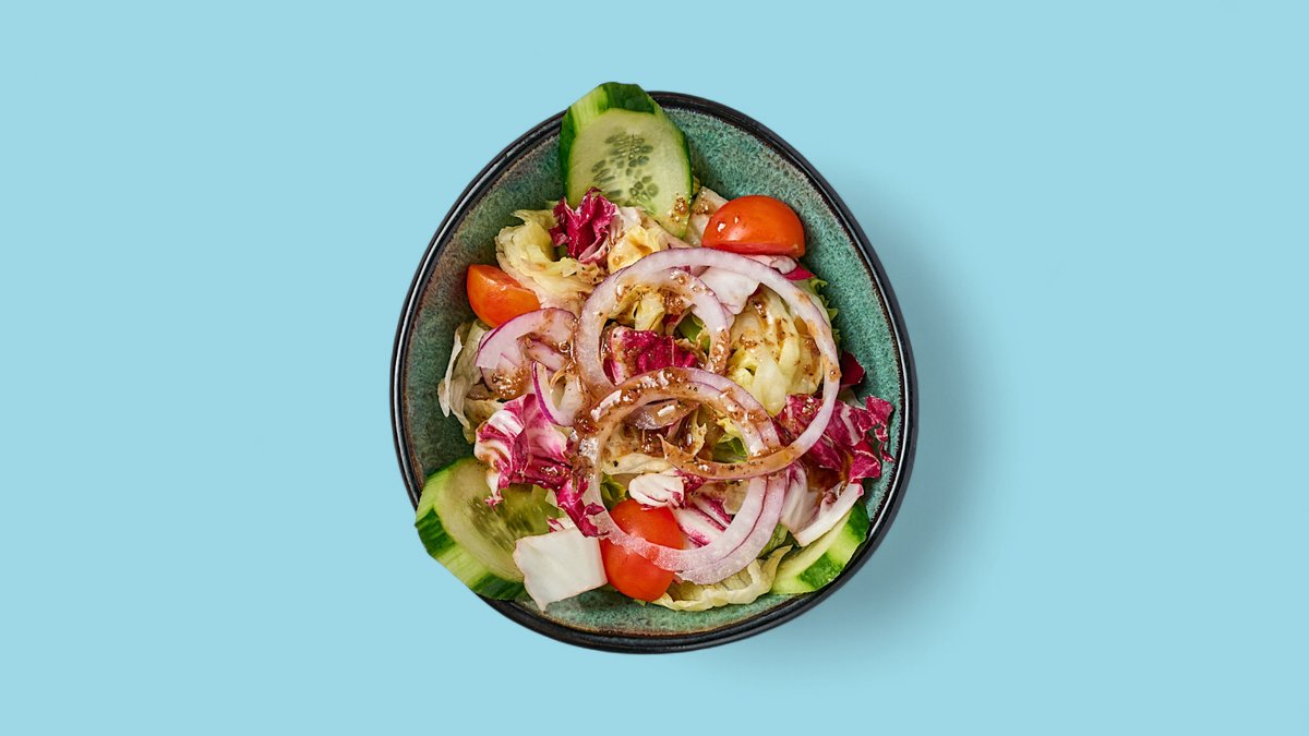 alle Salate werden mit Eisbergsalat, Radicchio, Kirschtomaten, Gurken und einem Dressing deiner Wahl zubereitet (“Meeresfrüchte Salat„ wird ohne Eisbergsalat, Radicchio, Kirschtomaten und Gurken zubereitet)