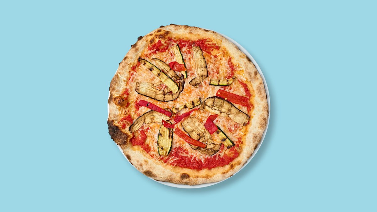 mit Mozzarella-Ersatz, gegrilltem Gemüse aus dem Holzofen, Zucchini, Auberginen und Paprika