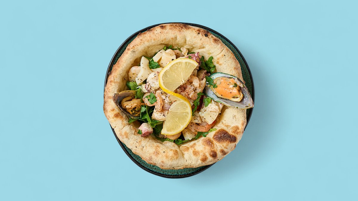 mit frischen hausgemachten Meeresfrüchten, Olivenöl, Knoblauch, frischer Petersilie und Zitrone