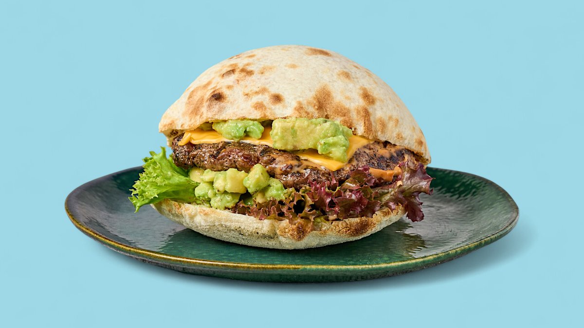 mit Underdog's-Brötchen aus dem Holzofen, roten Zwiebeln, Cheddar, Avocado und Underdog's-Burgersoße