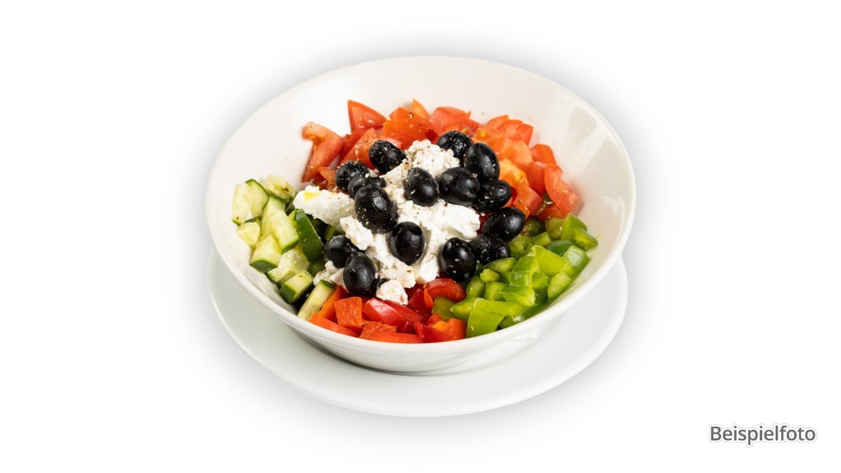 mit Feta, Peperoni, Oliven, roten Zwiebeln und Tomaten