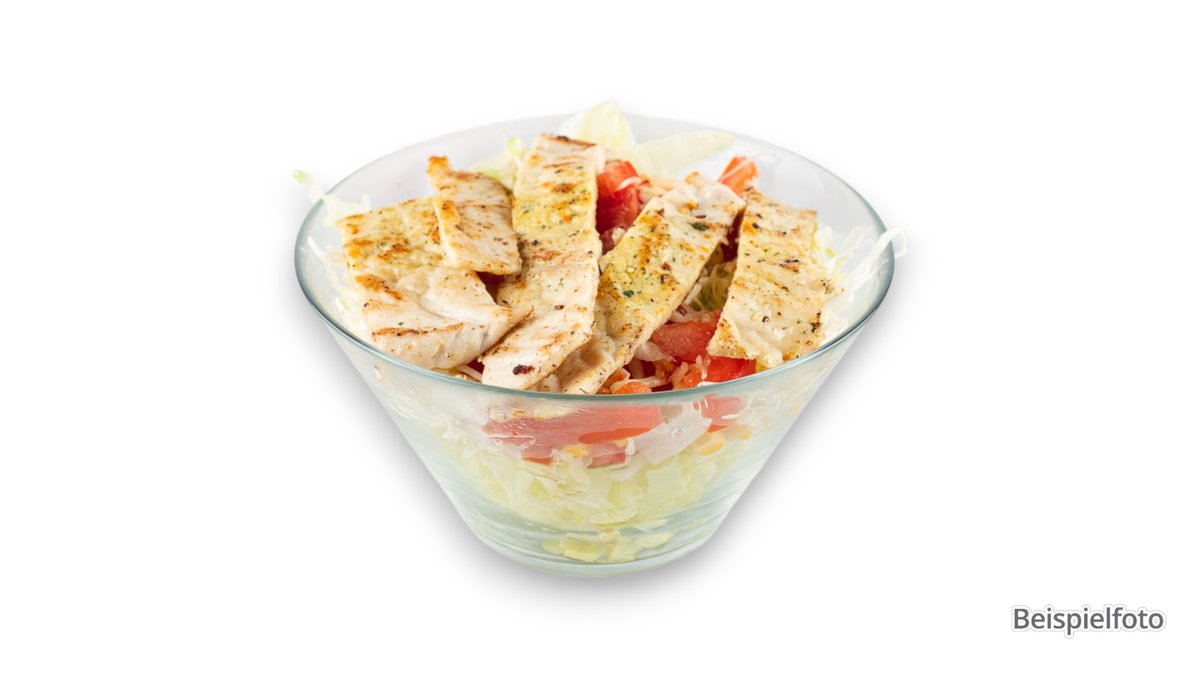 gefüllt mit Schwein, mit Röstzwiebeln und buntem Beilagensalat, auch vegetarisch möglich