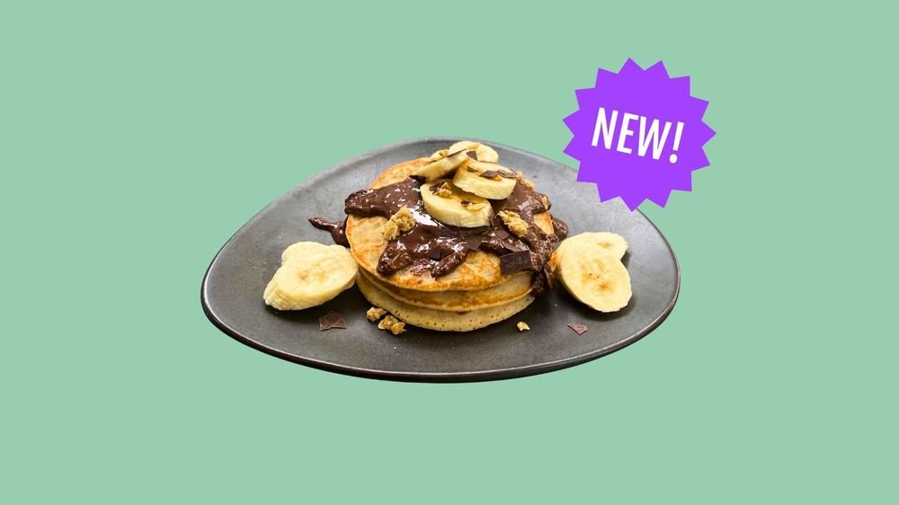 Pancakes, Granola, Chrunchy Protein Creme, Bananas, Dark Chocolate