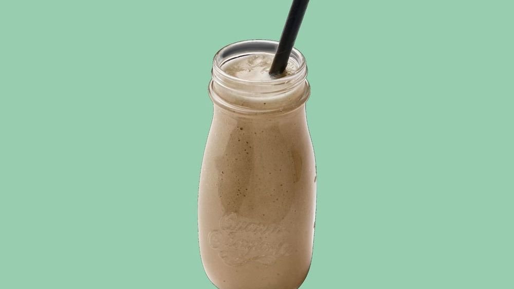 Bananas, Crushed Ice, Vegan Protein Powder, Cocoa Powder, Flaxseeds, Soy Drink, Homemade Peanut Butter