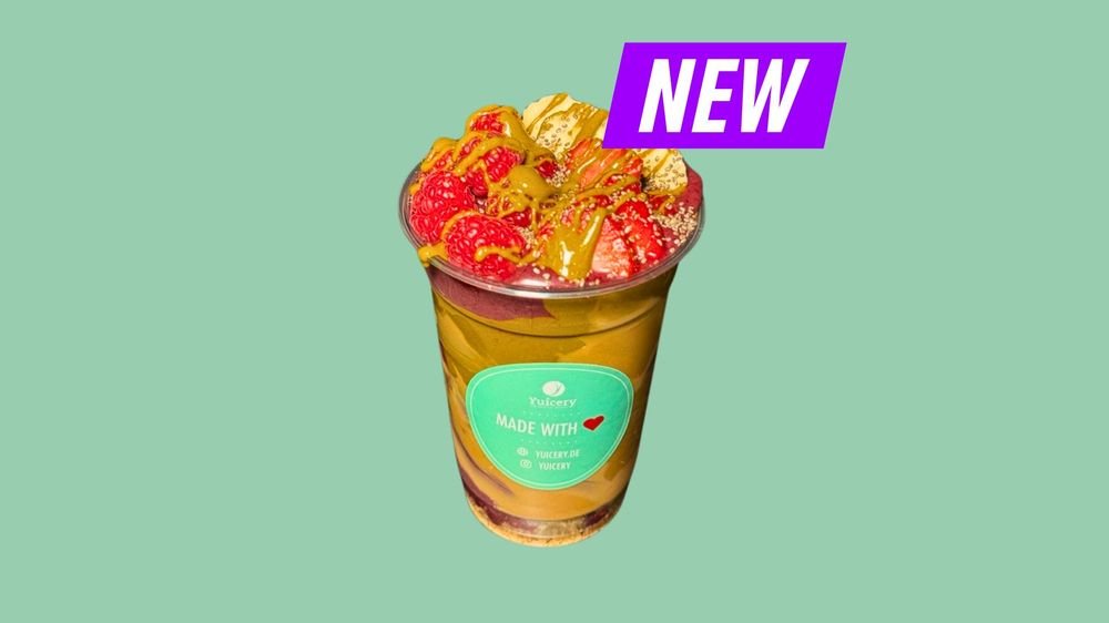 Bananen, Heidelbeeren, Acaipürree, Pistaziencreme, Pistazienmus, Granola, Chiasamen, Kokosraspel, Zartbitterschokolade, Himbeeren, Bananen, Erdbeeren