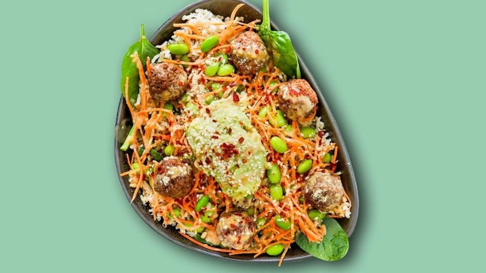 Baby Spinach, Rice, Greenforce Meatballs, Edamame, Carrots, Avocado, Roasted Sesam Sauce, Chili Flakes, Sesame, Cashew Flakes
