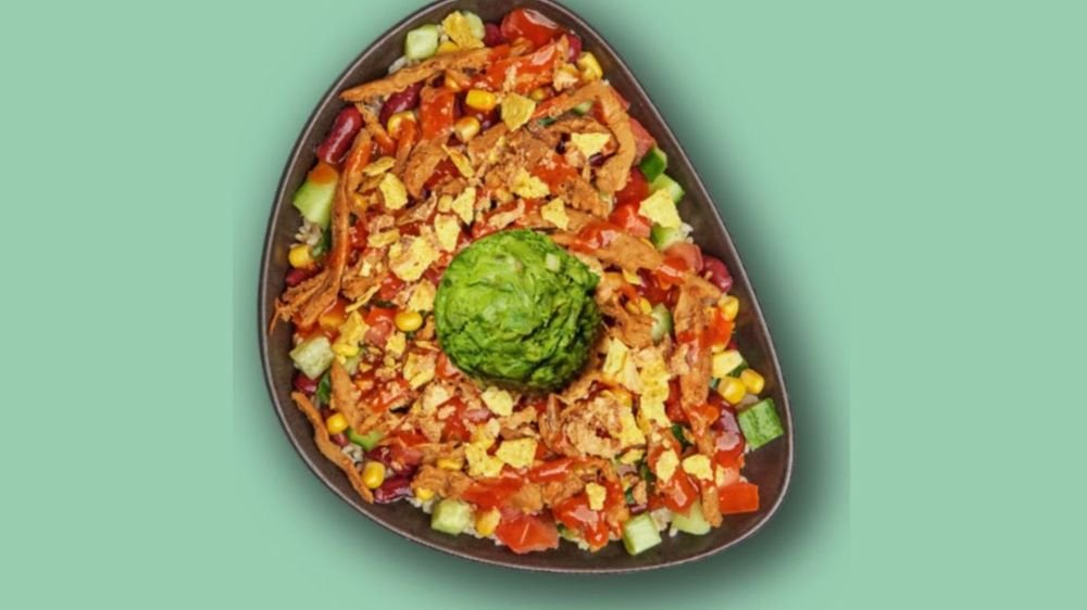 Rice, Salad, Beyond Chick'n Tenders, Cucumber, Avocado, Tomatoes, Fire Cracker Sauce, Roasted Sweet Corn, Tortillas