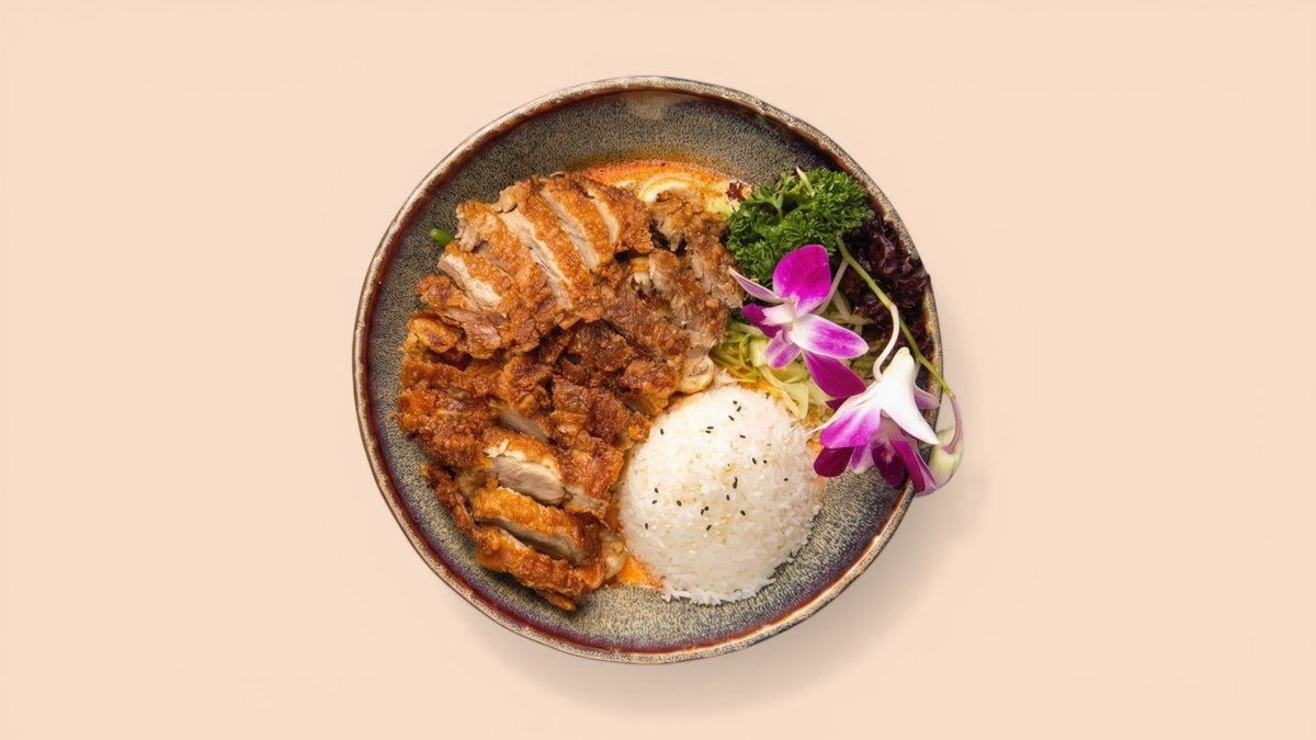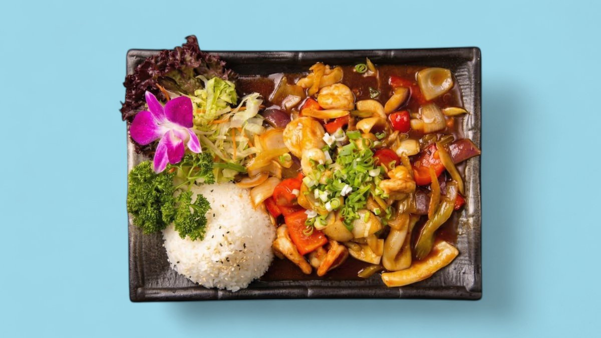 spicy Barbary duck breast stir-fried in a wok with basil, garlic, baby corn, green beans, zucchini, Di Di special sauce and jasmine rice