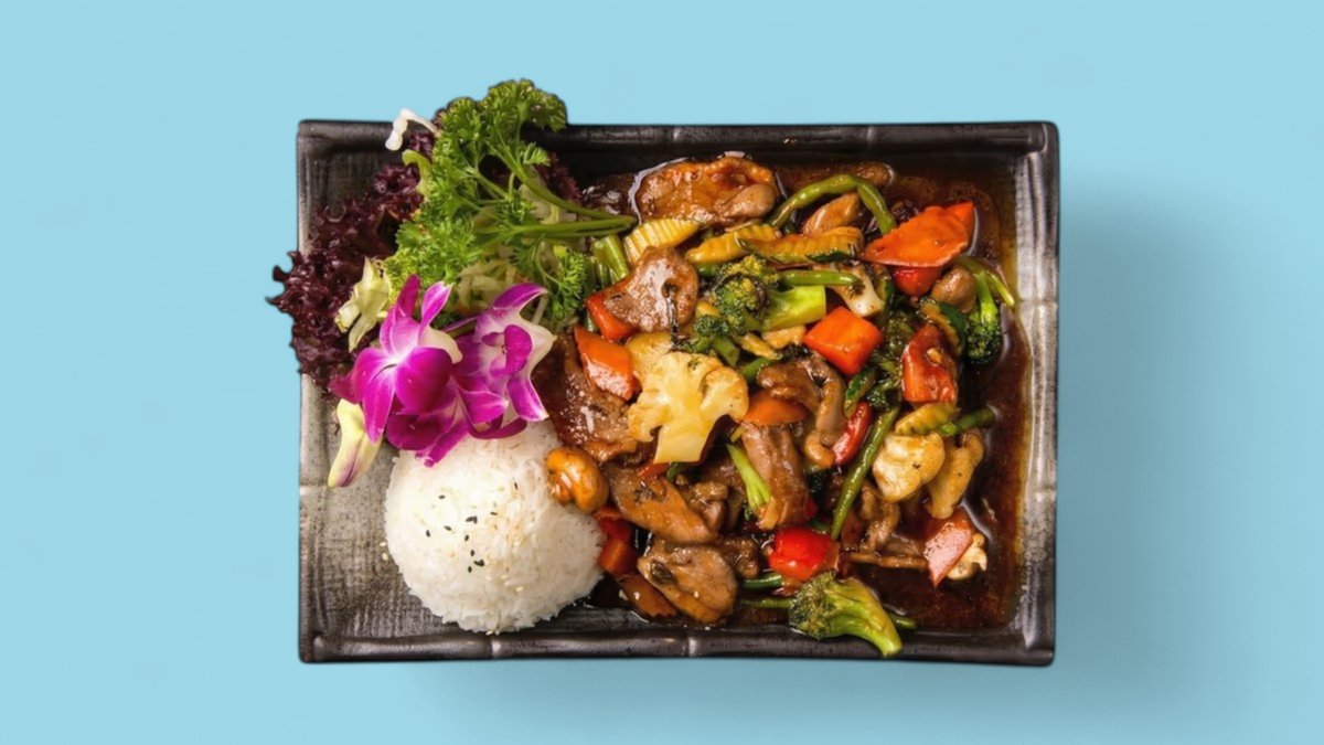 slightly spicy wok fried vegetables in a slightly spicy red coconut curry sauce, jasmine rice and an ingredient of your choice