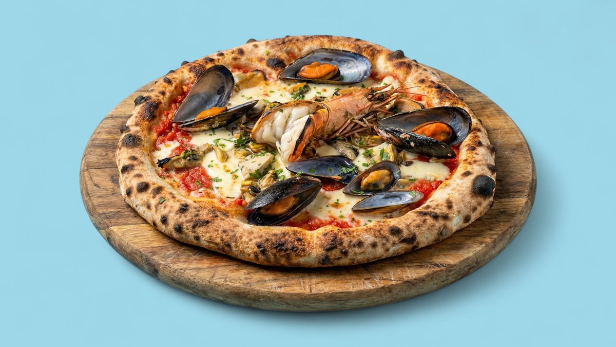 with tomato sauce, mozzarella and seafood