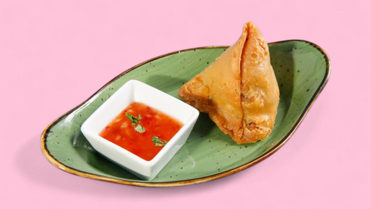 1 Stück, frittiert würzig gefüllte Teigtasche mit kleinem gemischten Salat