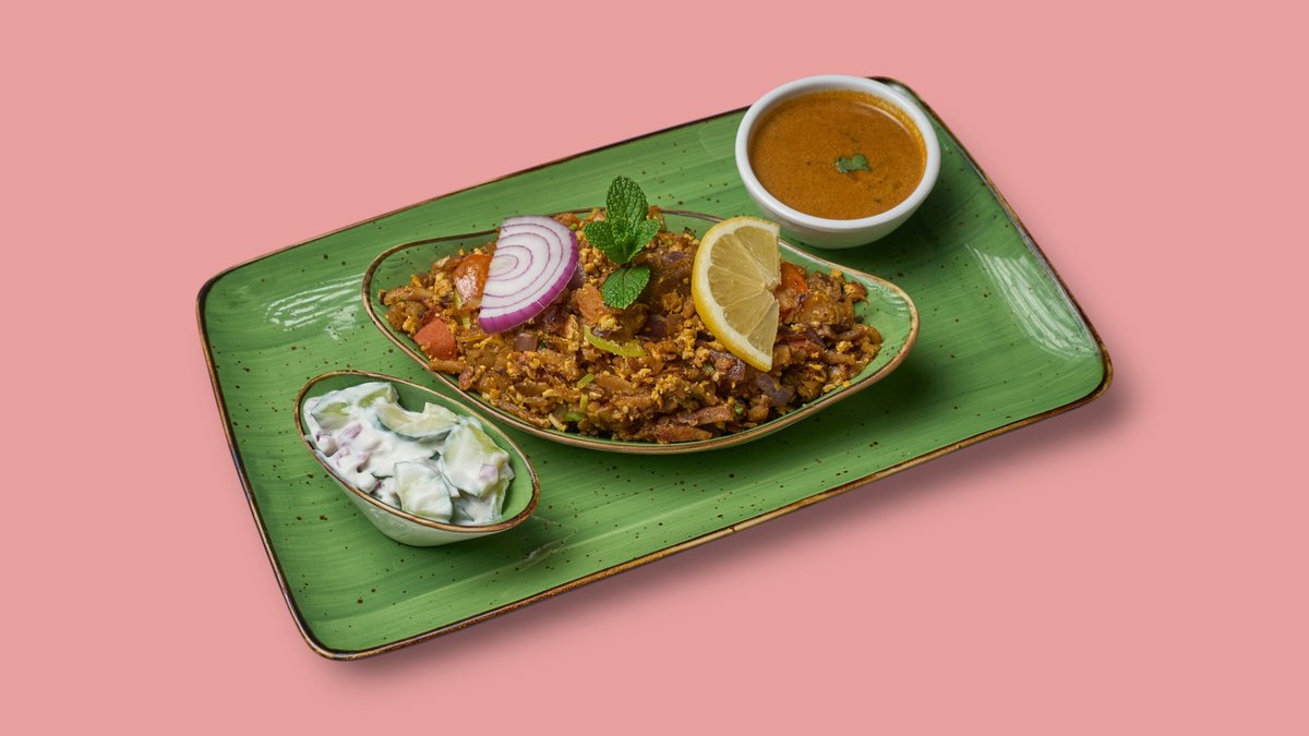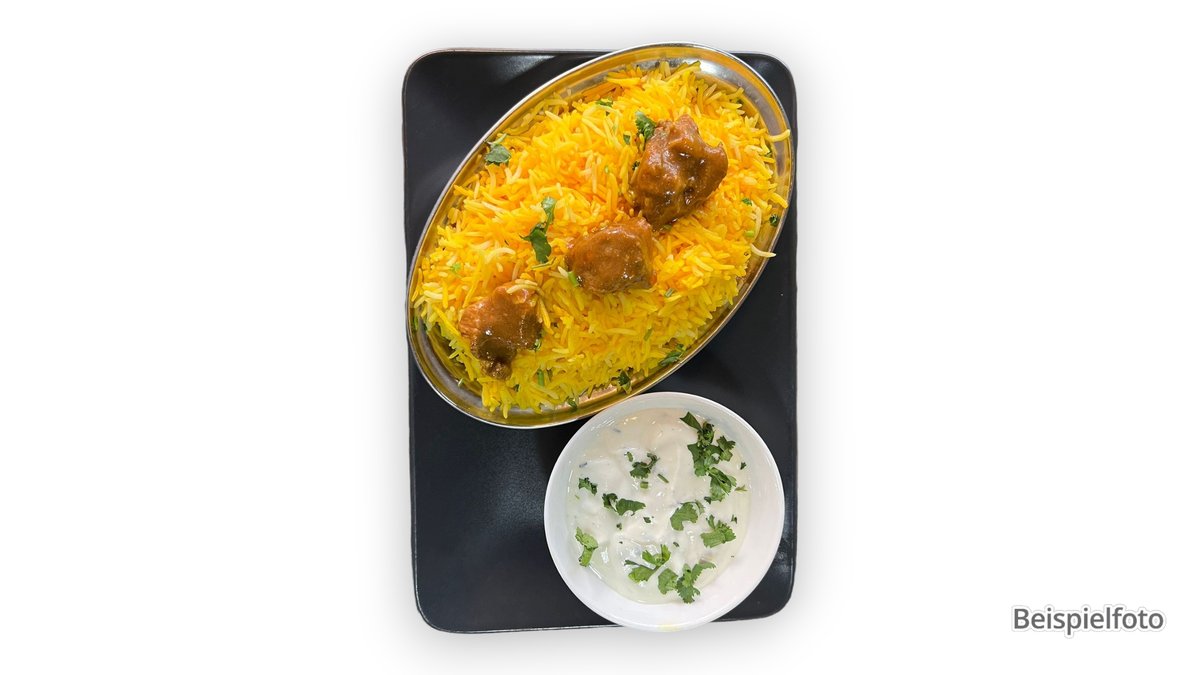 mit Raita, Basmatireis, Hähnchenfleisch, Gewürzen, Joghurtsoße und Eiern