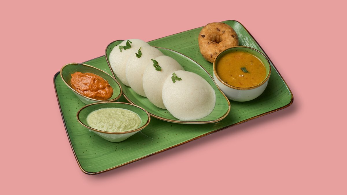 frittierter Reiskuchen mit Chutney, Sambar und Gewürzmischung