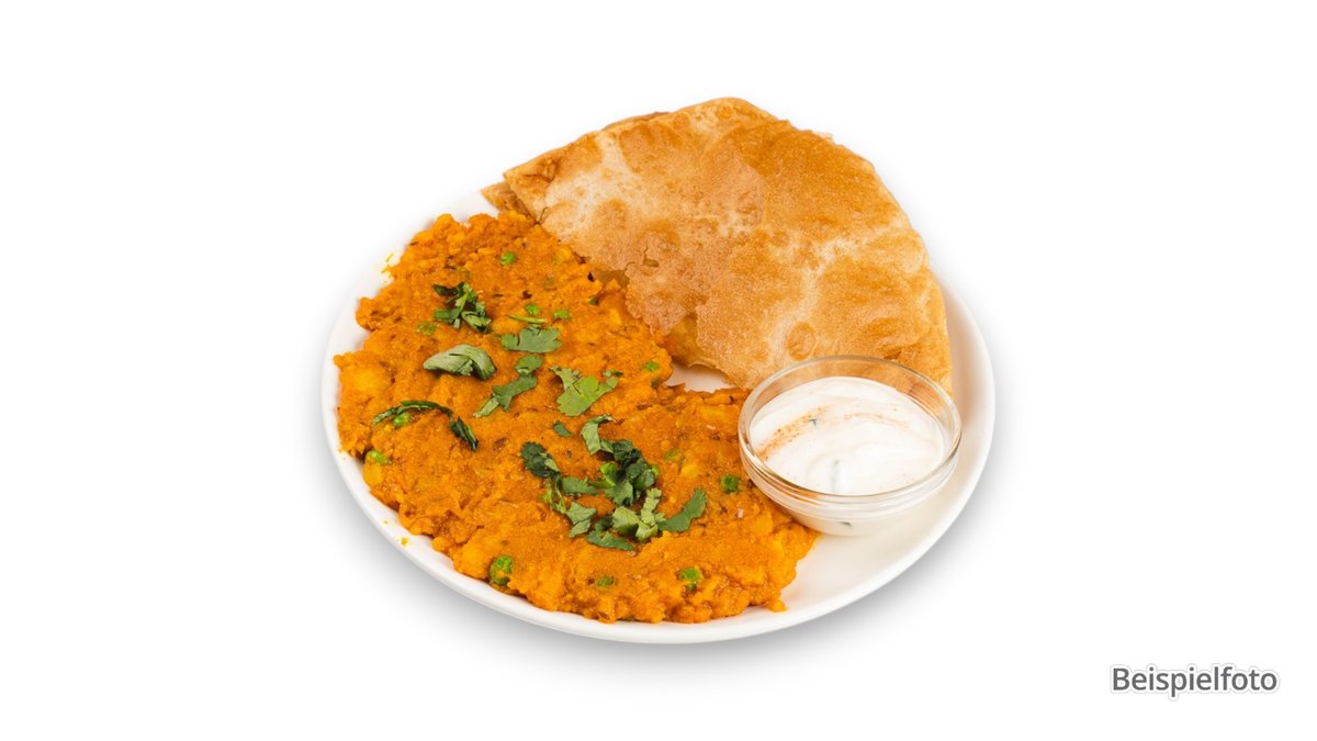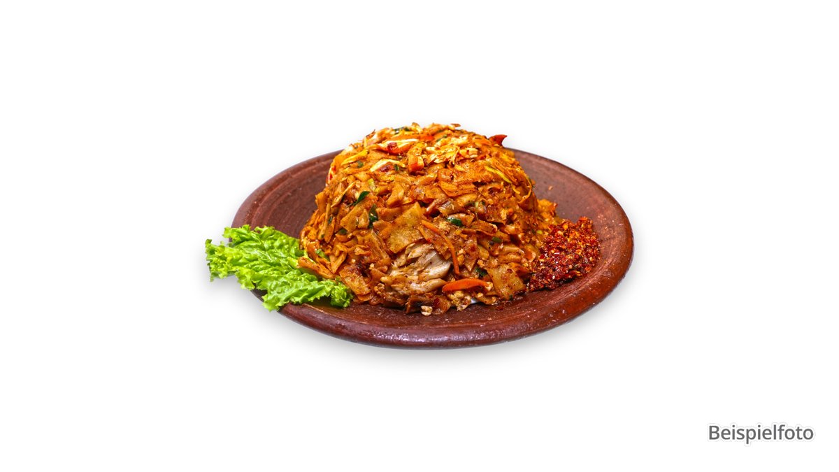 gebratenes Fladenbrot mit Hähnchenfleisch, Eiern, Gemüse und Currysoße