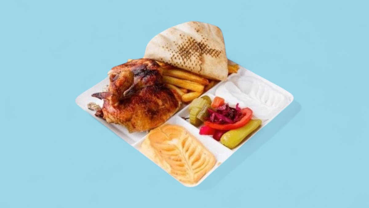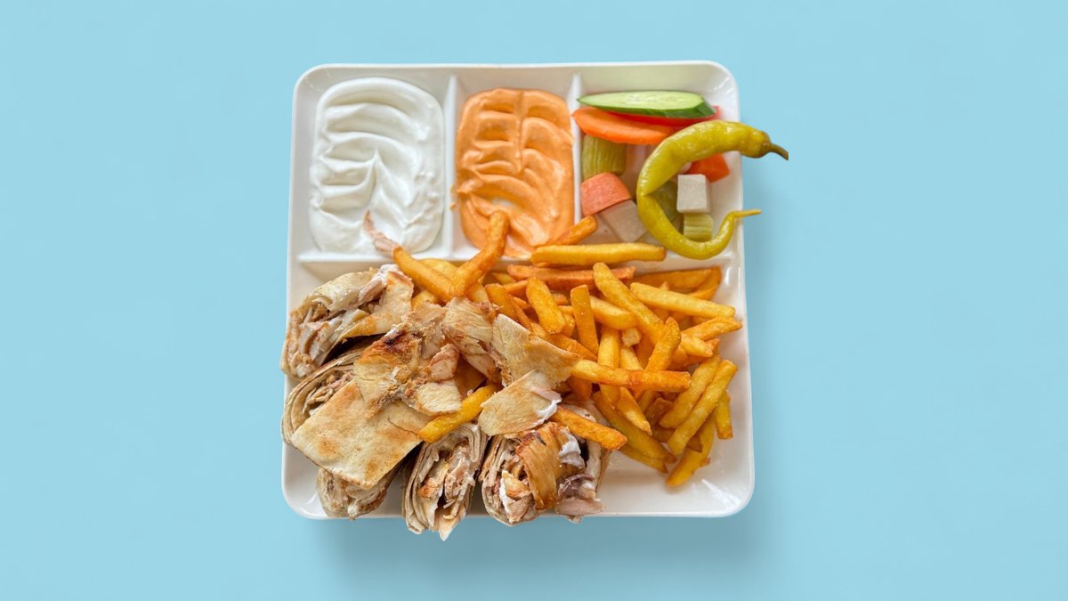 alle Gerichte werden mit Hähnchenfleisch, Fladenbrot, Knoblauchsoße und eingelegten Gurken zubereitet