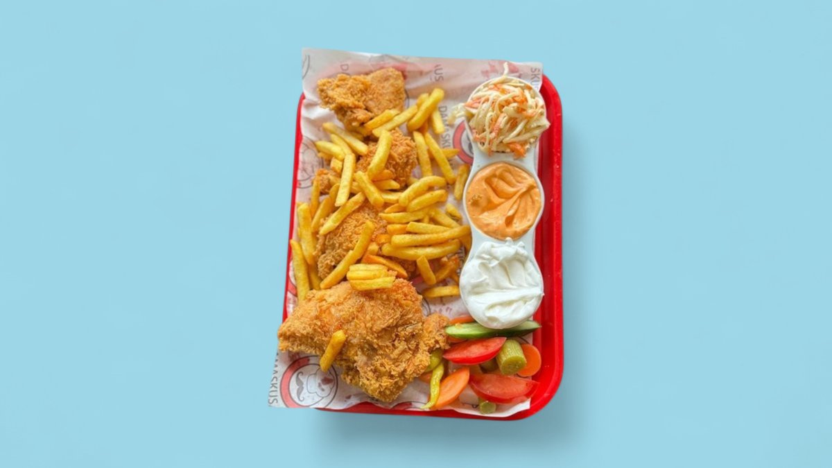 alle Gerichte werden mit frisch panierten Hähnchenteilen, Fladenbrot, Knoblauchsoße, eingelegten Gurken, Salat und Pommes frites zubereitet und können auf Wunsch auch scharf zubereitet werden („21. Crispy Chicken Sandwich” kann nicht scharf zubereitet werden)