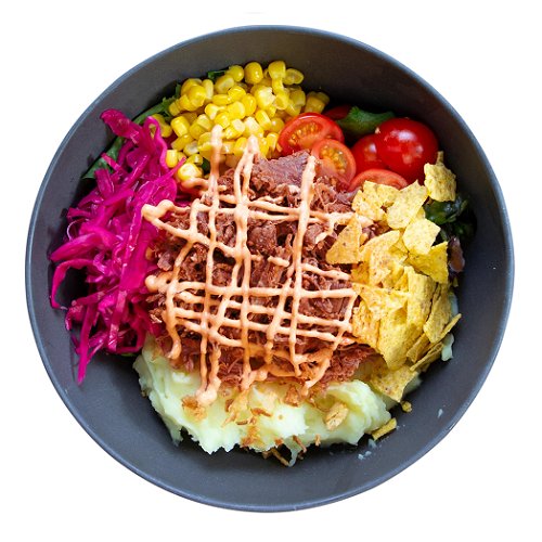 mit Salat-Mix, Puebla-Dressing, mariniertem Rotkohl, Cocktailtomaten, Mais, gezogenem Rindfleisch, Chipotlesoße und Tortilla Chips