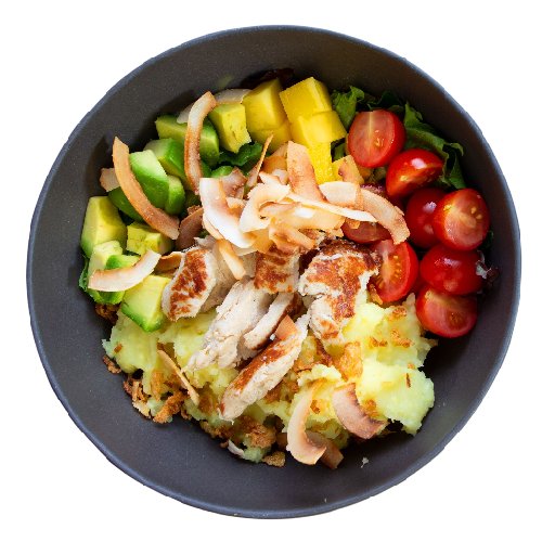 mit Salat-Mix, Mango-Kokos-Dressing, Cocktailtomaten, Mango, Avocado, Pfannenhähnchen und Kokoschips
