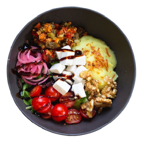 alle Bowls werden mit Kartoffelstampf, Röstzwiebeln, Gouda und Joghurtsoße zubereitet