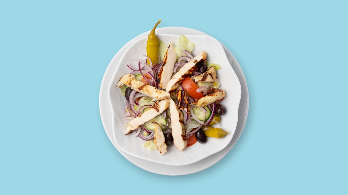 mixed salad with chicken breast strips, tomatoes and cucumbers