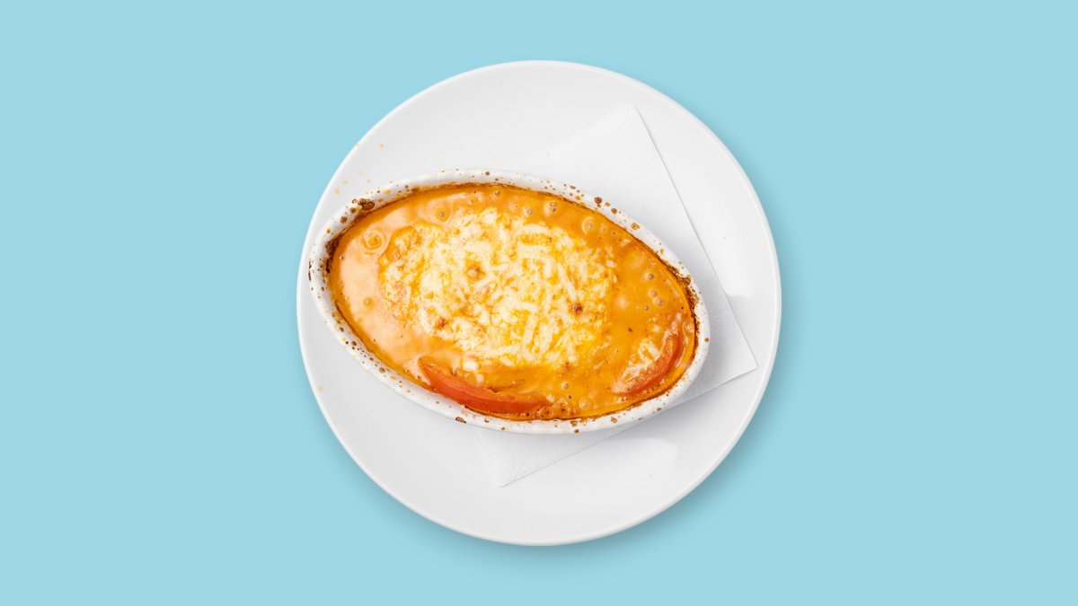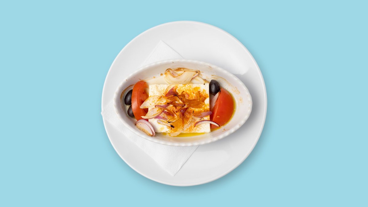 sheep cheese with Metaxa sauce, tomatoes and onions baked