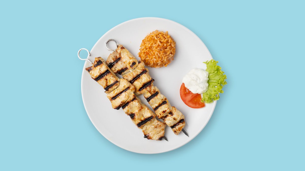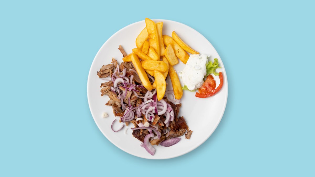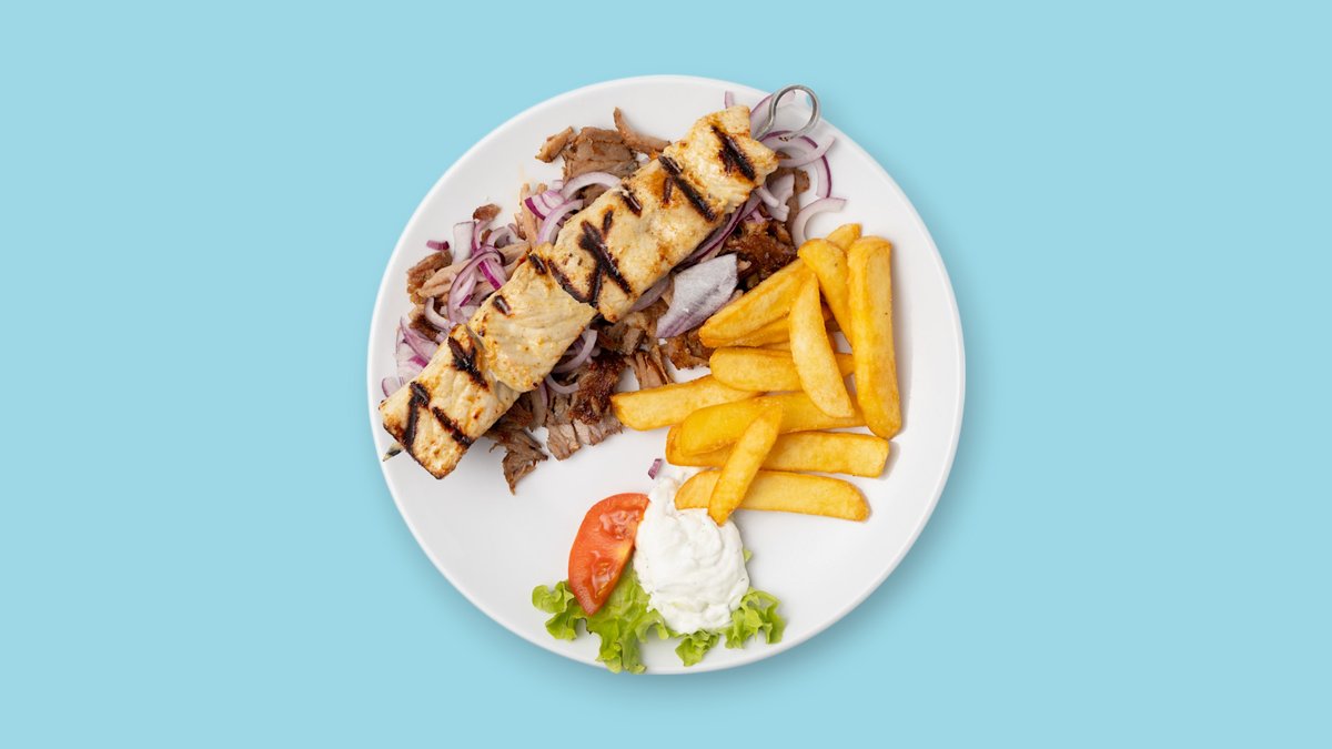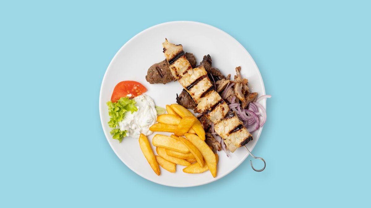 with pork fillet, souvlaki, lamb fillet, chicken breast fillet, tzatziki and French fries