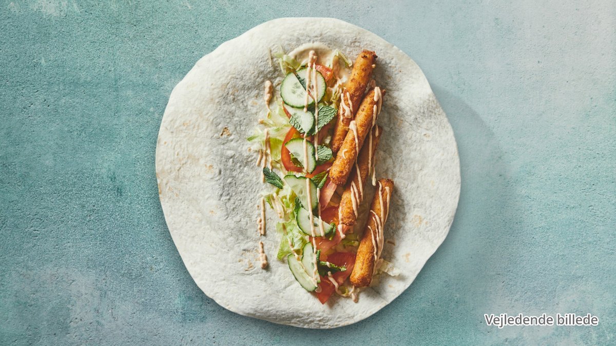 Wrap med fyld af falafel, feta, avocado fries, salat og dressing.