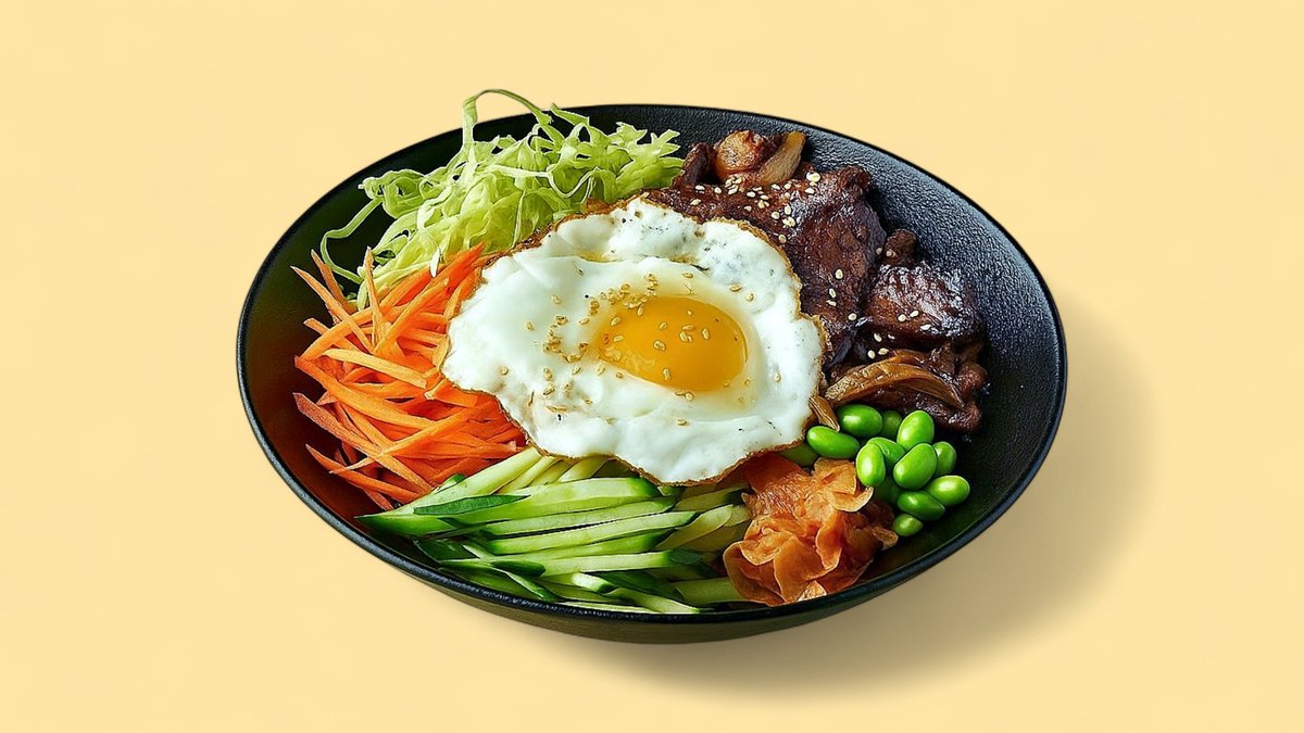 Oksekød, gulerødder, agurker, æg, gochujang, ris og edamamebønner.