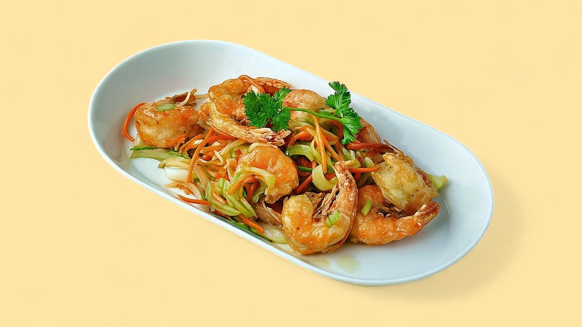 Wokstegte rejer, gulerødder, agurker, iceberg, æg,g ochujang og edamame bønner.