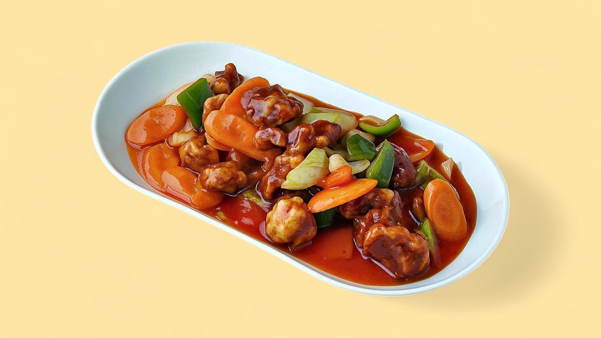 Gong Bao kylling m. grøntsager og toppet med peanuts