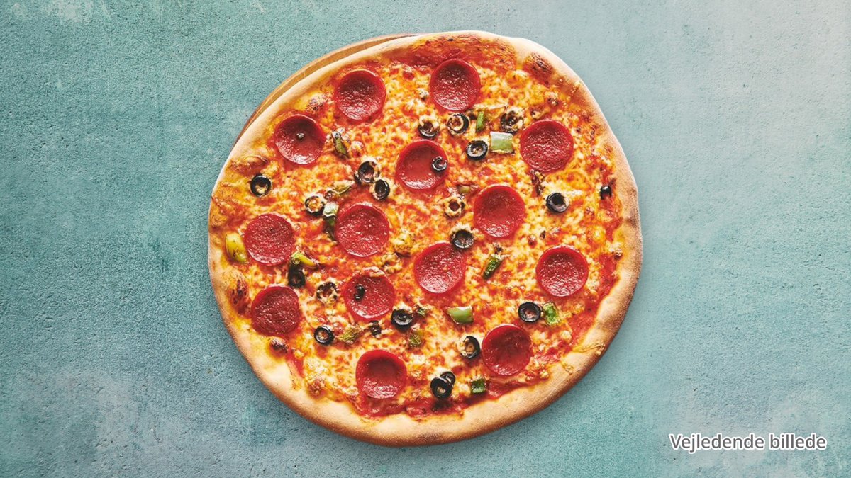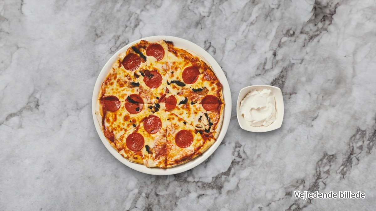 Tomatsauce, ost, pepperoni, kebab og chili.