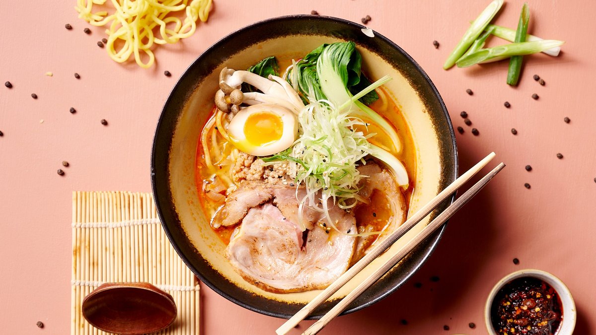 Spicy Misobaseret ramen med svine chashu, hakket svinekød, bok choy, svampe, majs, chili, æg & nori.