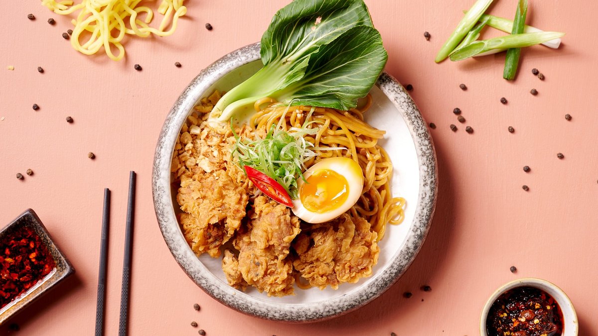 Ramen-nudler, mamii's signatursauce, stegt kylling, lime, bok choy, stegte hvidløg/løg, knust peanut, æg