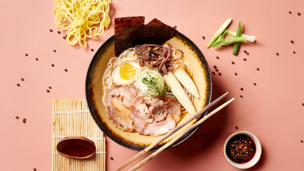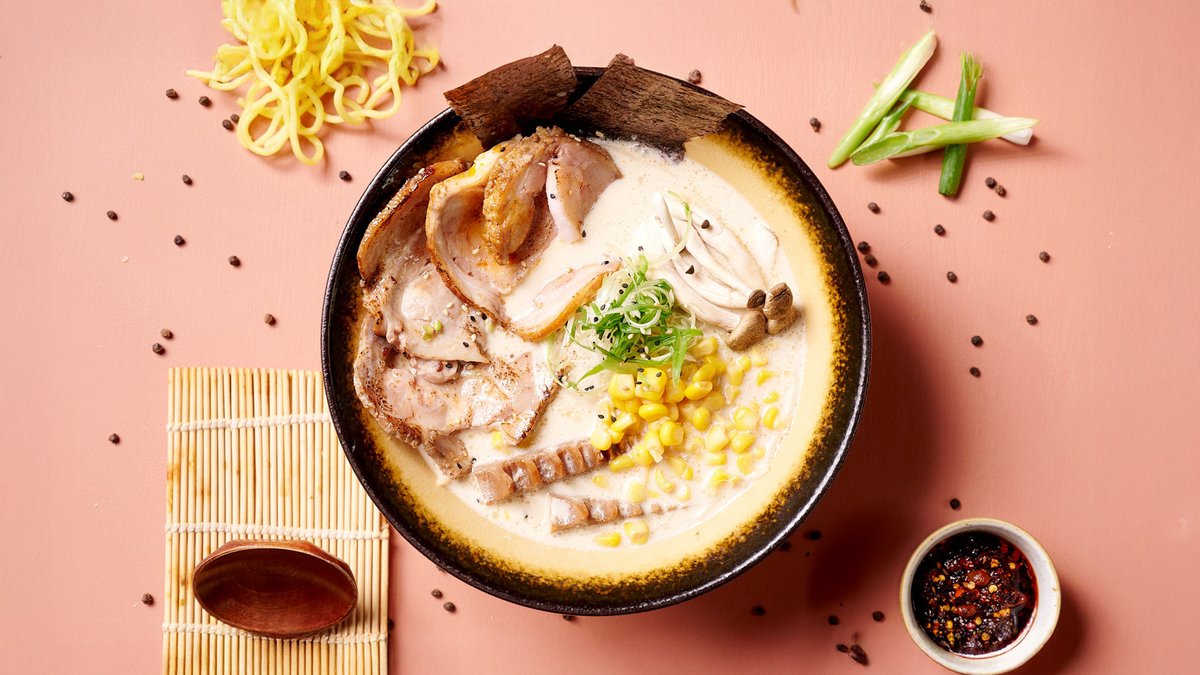 Tonkotsubaseret ramen med svine chashu, svampe, majs, bamboo, bønnespirer, æg, nori