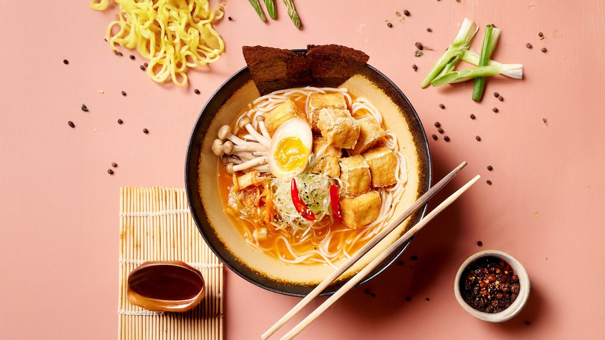 Kimchibaseret ramen med hjemmelavet kimchi, svine chashu, tofu, svampe, æg, nori.