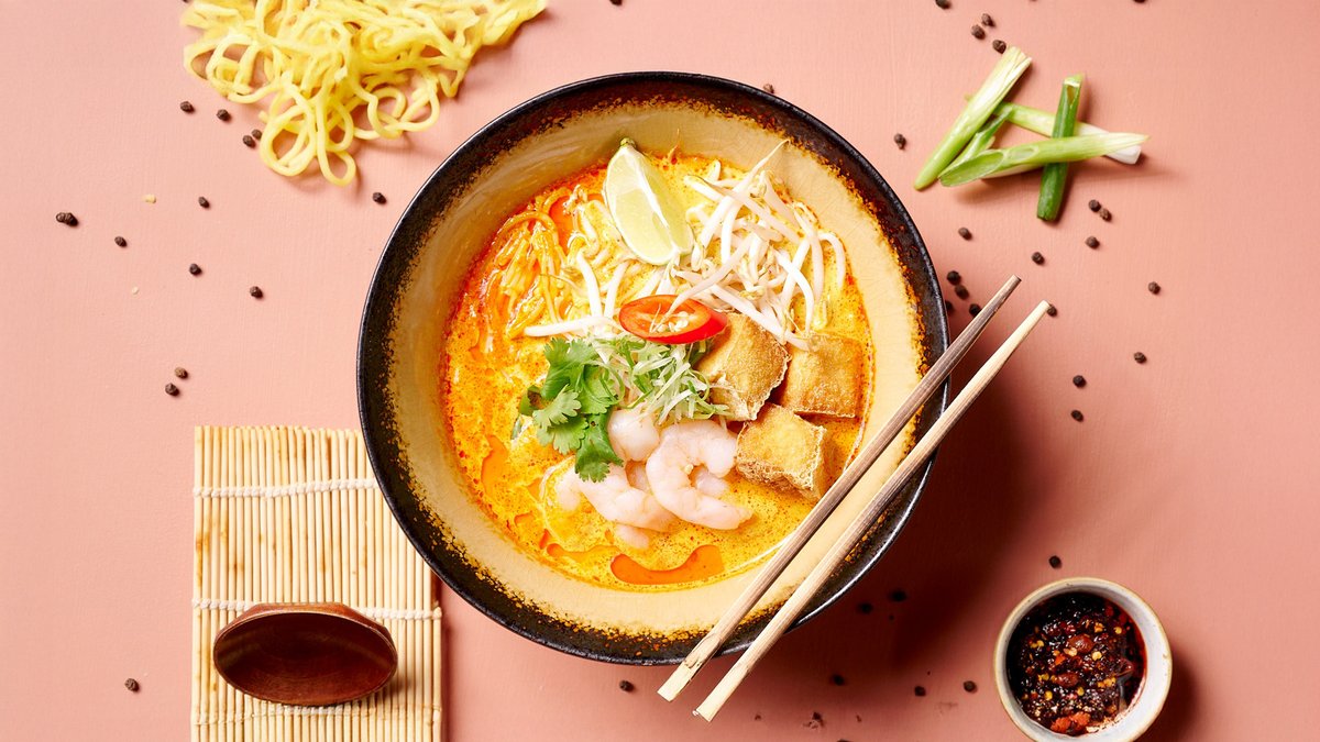 Kokosmælk rød karrysuppe med risnudler, tofu, rejer, bønnespirer, lime, koriander. (laktose)