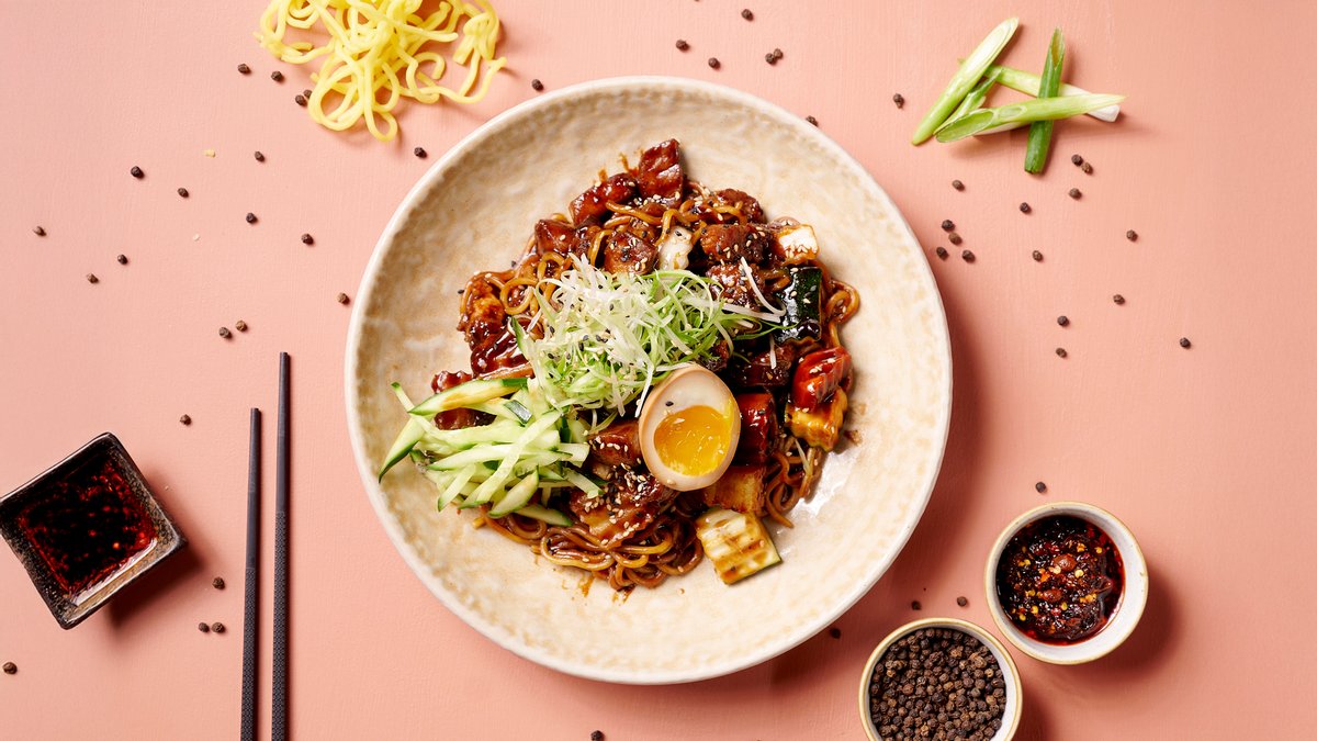Nudler, hjemmelavet sort bønnesauce, agurk, blandede grøntsager, svinekød, æg, sesam